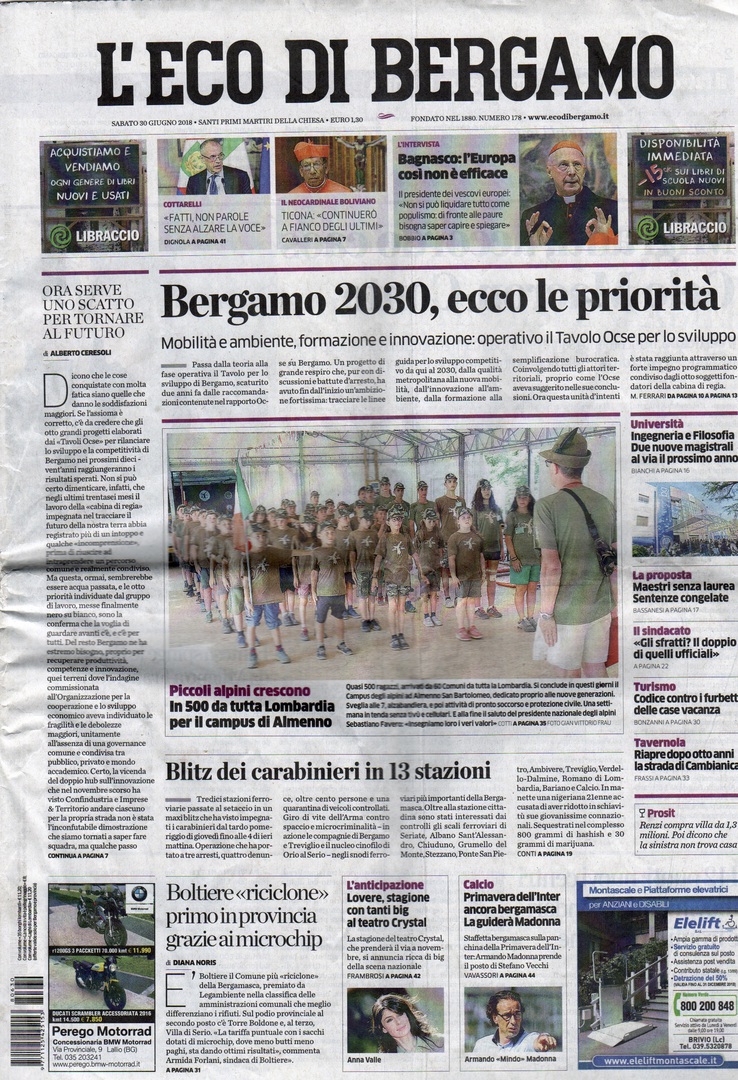 1ª PAGINA ECO DI BERGAMO - 30 giugno 2018<< Nuova immagine con testo >>